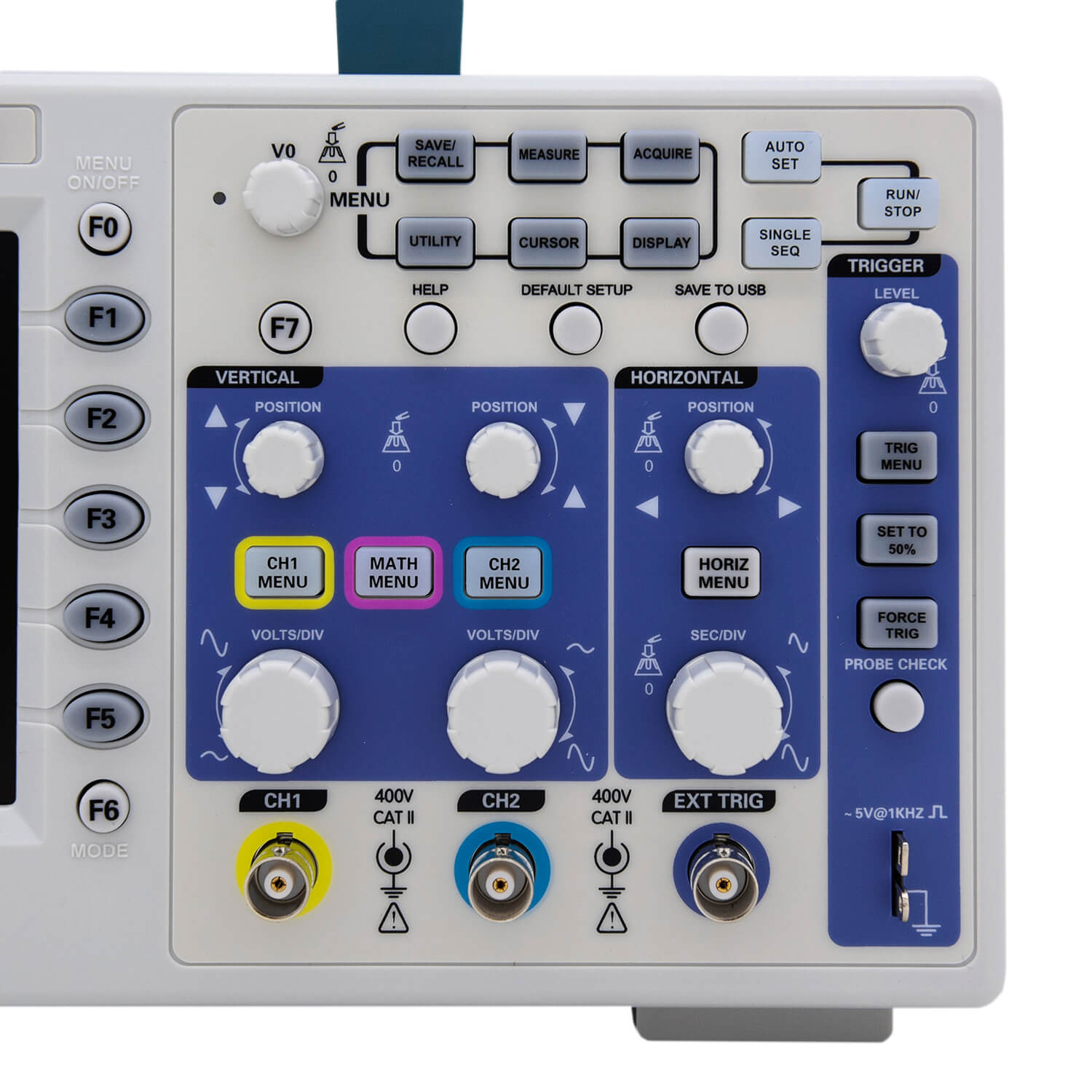 Hantek DSO 5202р - двухканальный портативный мультиметр. Применяется для выявления временных параметров сигнального напряжения и искажения, которое создает заданный участок цепи, определения вида шума и его колебаний. Прибор оснащен множеством дополнительных функций, дающих возможность ускорить работу оператора в электронике и диагностировании автомобильных систем. Предусмотрена поддержка USB-носителей и возможность подключения компьютера для сохранения исследований в онлайн-режиме. Устройство имеет цветной монитор, экран можно разделить на два окна в режиме масштабирования.
